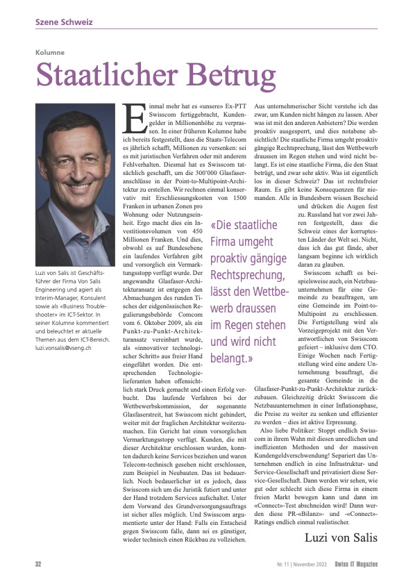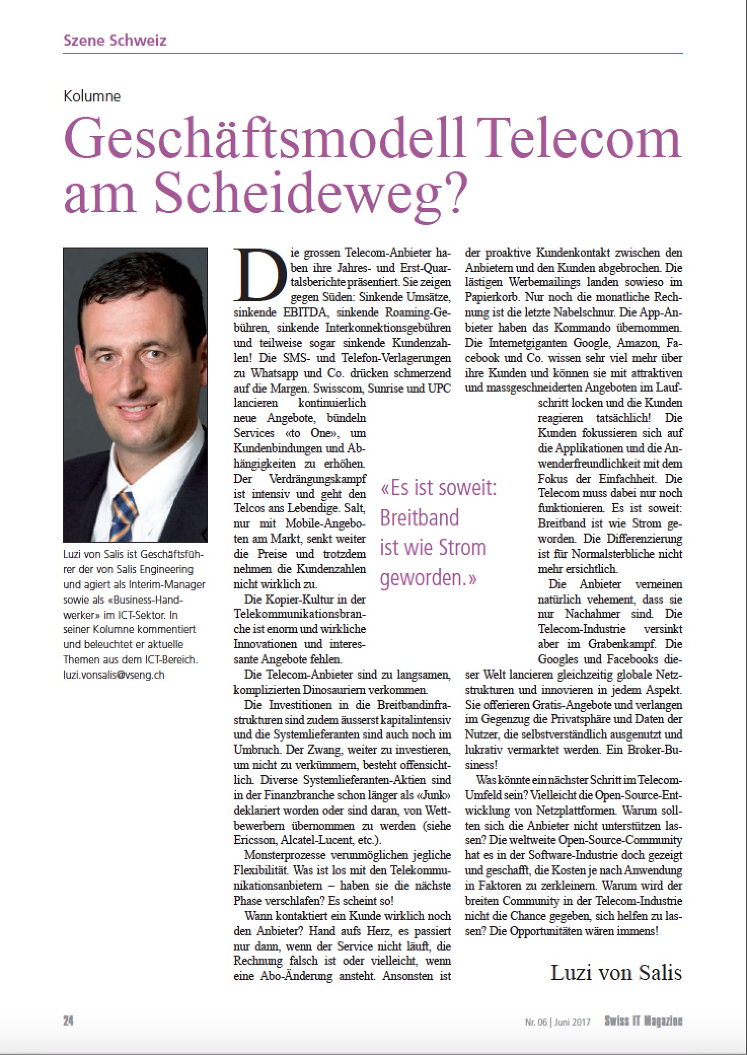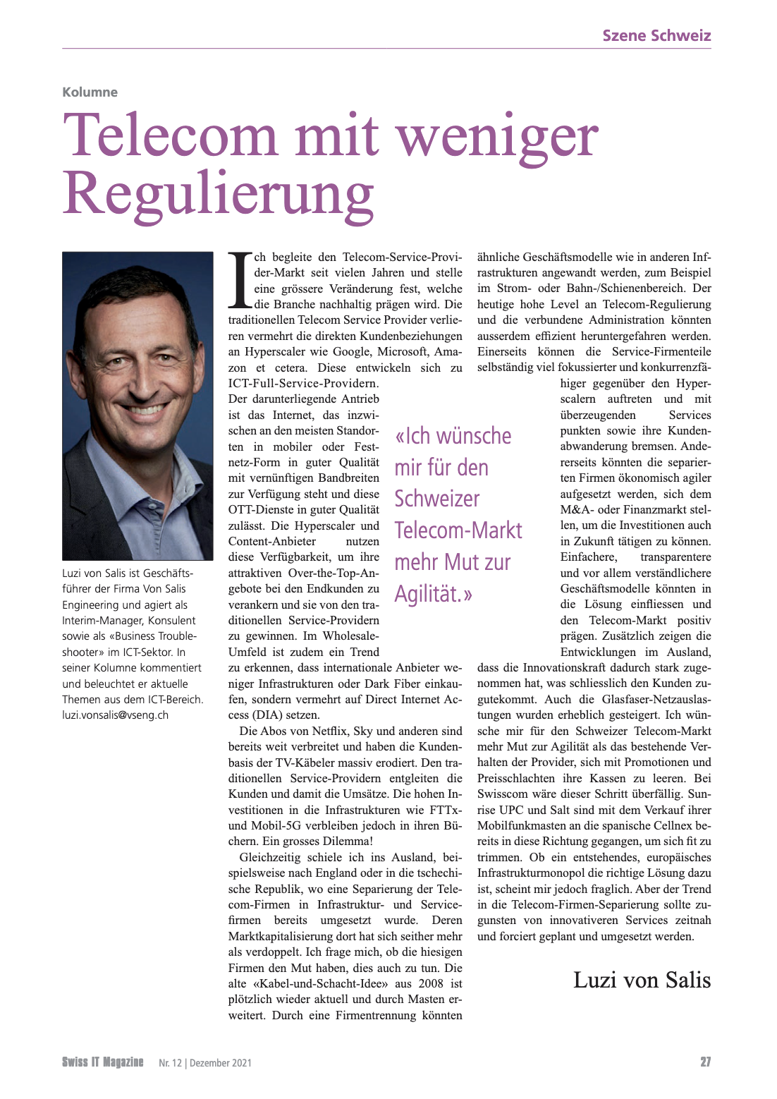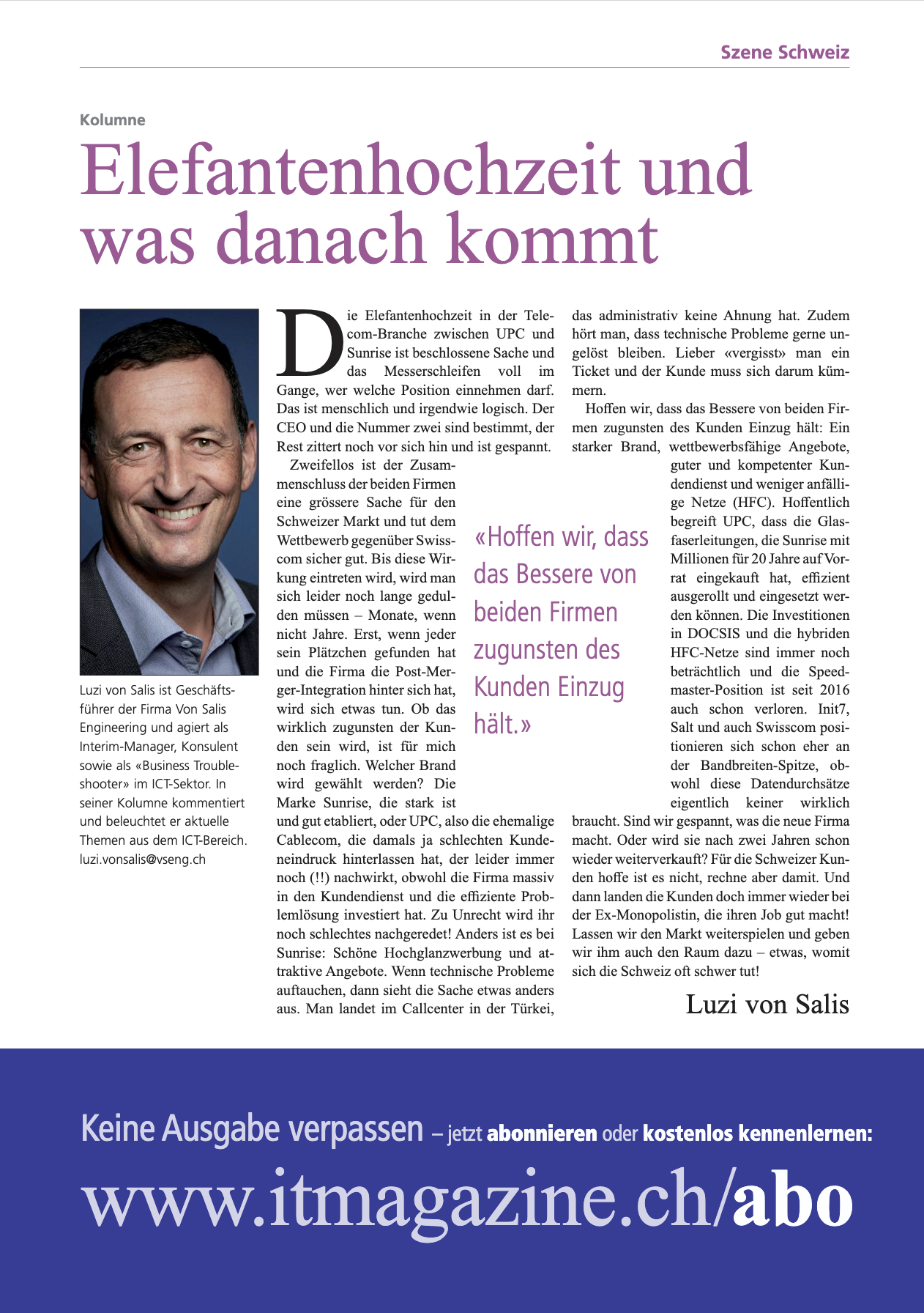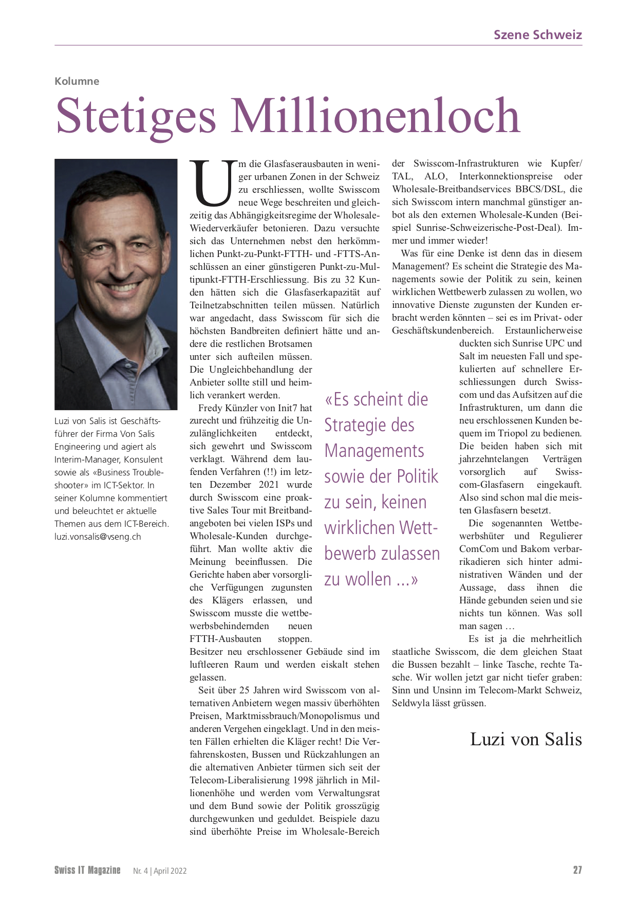 VSENG kommentiert pointiert aktuelle, geschäftliche Themen und schreibt im Swiss IT Magazin reglemässig über den ICT-Telecom Markt Schweiz. Meinungen werden authentisch, kritisch und persönlich formuliert.
